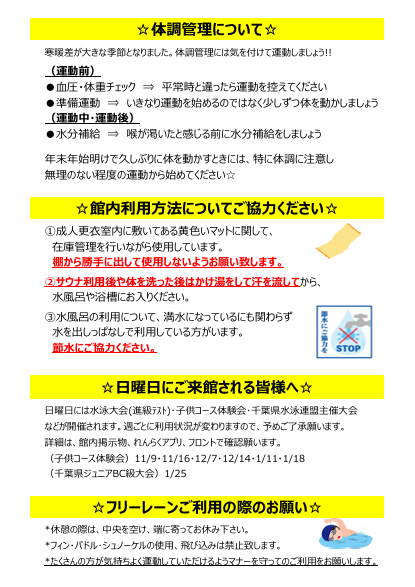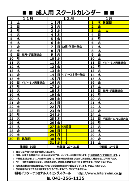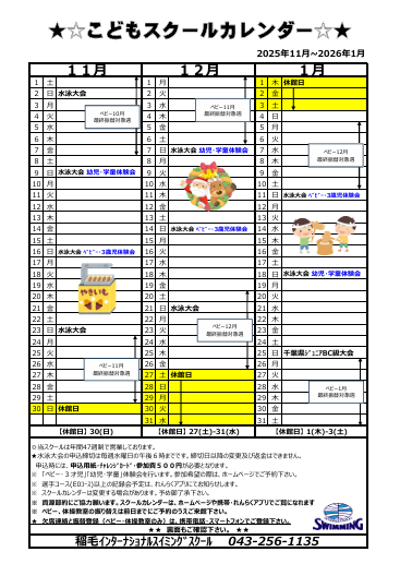 スクールカレンダートップ > スクールカレンダー子供スクールカレンダー(2025年11月〜2026年1月) 子供スクール11〜1月 成人スクールカレンダー(9〜11月) 成人スクール11〜1月 レッスンスケジュール タイムテーブル2025.11 フリーレーン2025.11 プールプログラム2025.6 スタジオプログラム2025.10 朝活プールプログラム2025.9