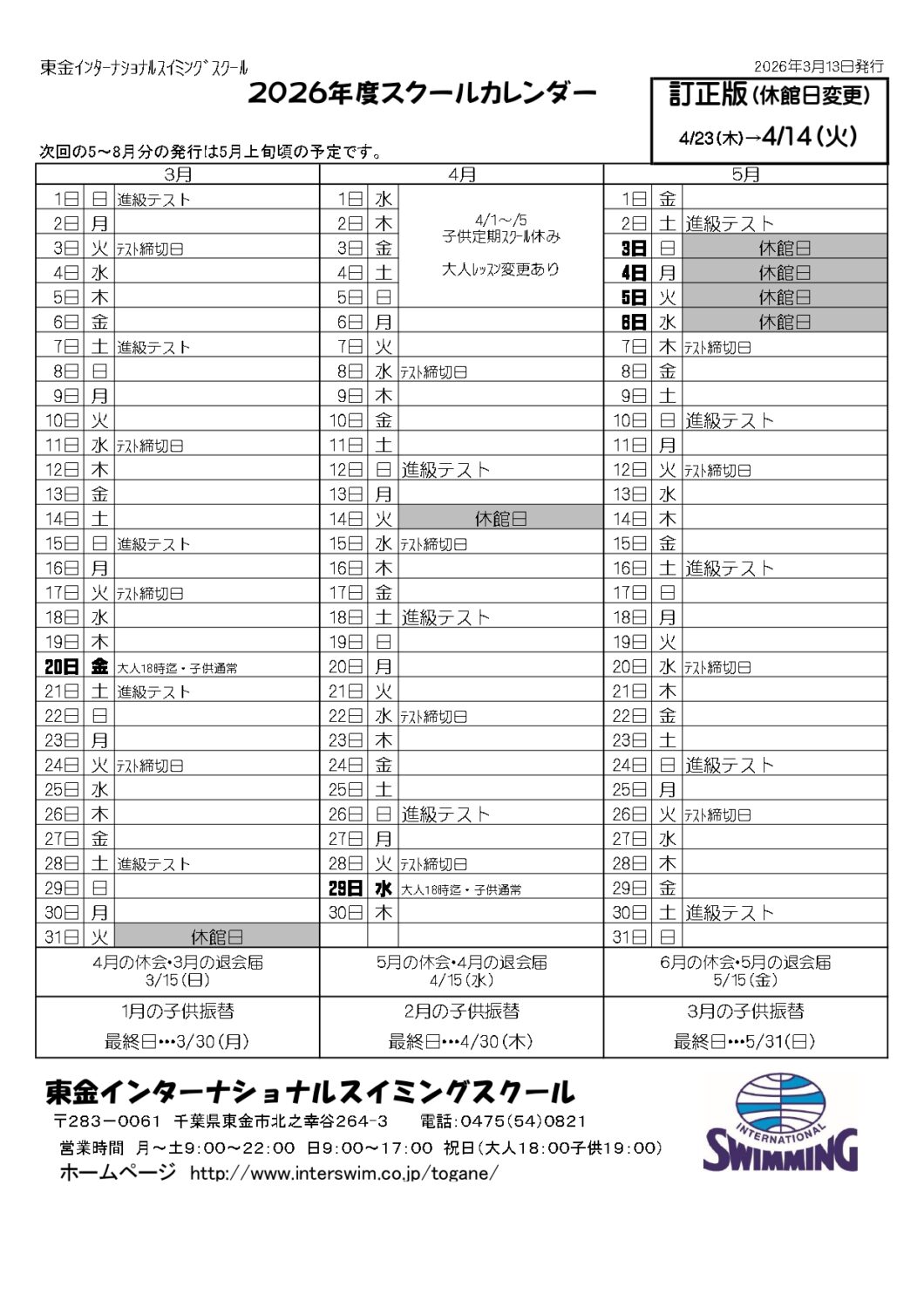 スクールカレンダートップ > スクールカレンダースクールカレンダー(3~5月・訂正版) スクールカレンダー2026.3~2026.5(訂正版) 大人レッスンスケジュール レッスンスケジュール2025.6〜